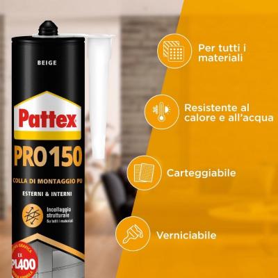 Pattex PRO 150 è un adesivo di montaggio professionale a base poliuretanica, ideale nei settori di falegnameria, edilizia, nautica e carpenteria per incollaggi strutturali che richiedono elevata resistenza al calore ed all’acqua.
