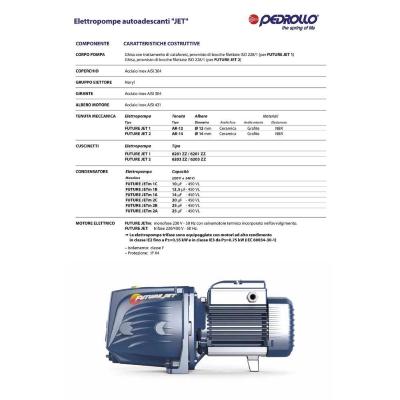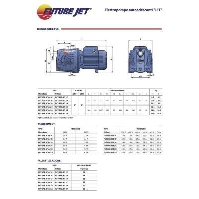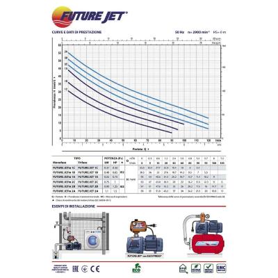 Le pompe autoadescanti FUTURE JET sono progettate per aspirare acqua anche in presenza di aria miscelata al liquido pompato. Per l'affidabilità e la semplicità di utilizzo sono consigliate per pompare acqua pulita in campo domestico, specialmente per la distribuzione dell'acqua in accoppiamento a piccoli o medi serbatoi autoclavi, per irrigazioni di orti e giardini, ecc