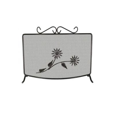 Parascintille per camini; bordatura in ferro pieno da 10 mm e decoro floreale centrale a rilievo su pannello in ferro a maglia, verniciato nero e con decoro superiore.