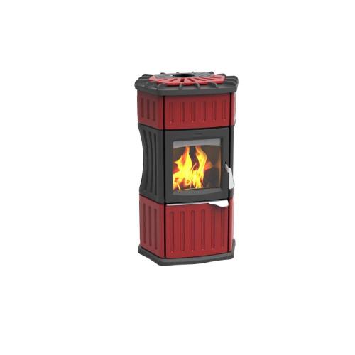 Stufa a legna dal design esclusivo di forma esagonale, rivestimento in ceramica e ghisa, focolare in ghisa e vermiculite/refrattario, vetro ceramico, testata in ghisa smaltata e ceramica, possibilità di collegamento aria comburente all’esterno